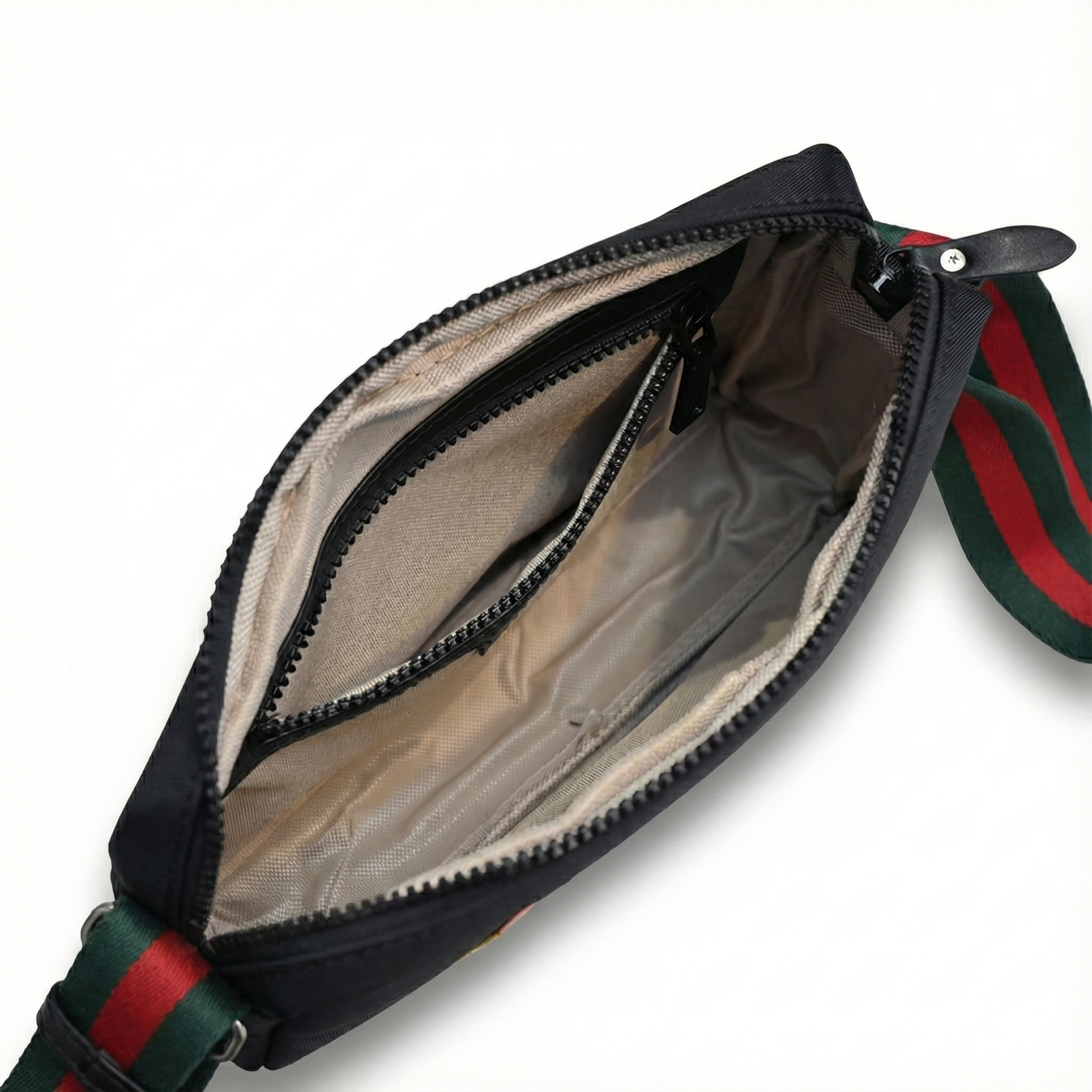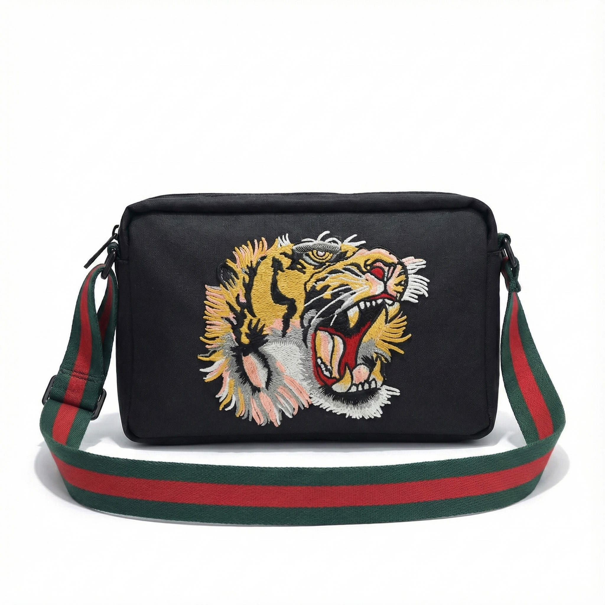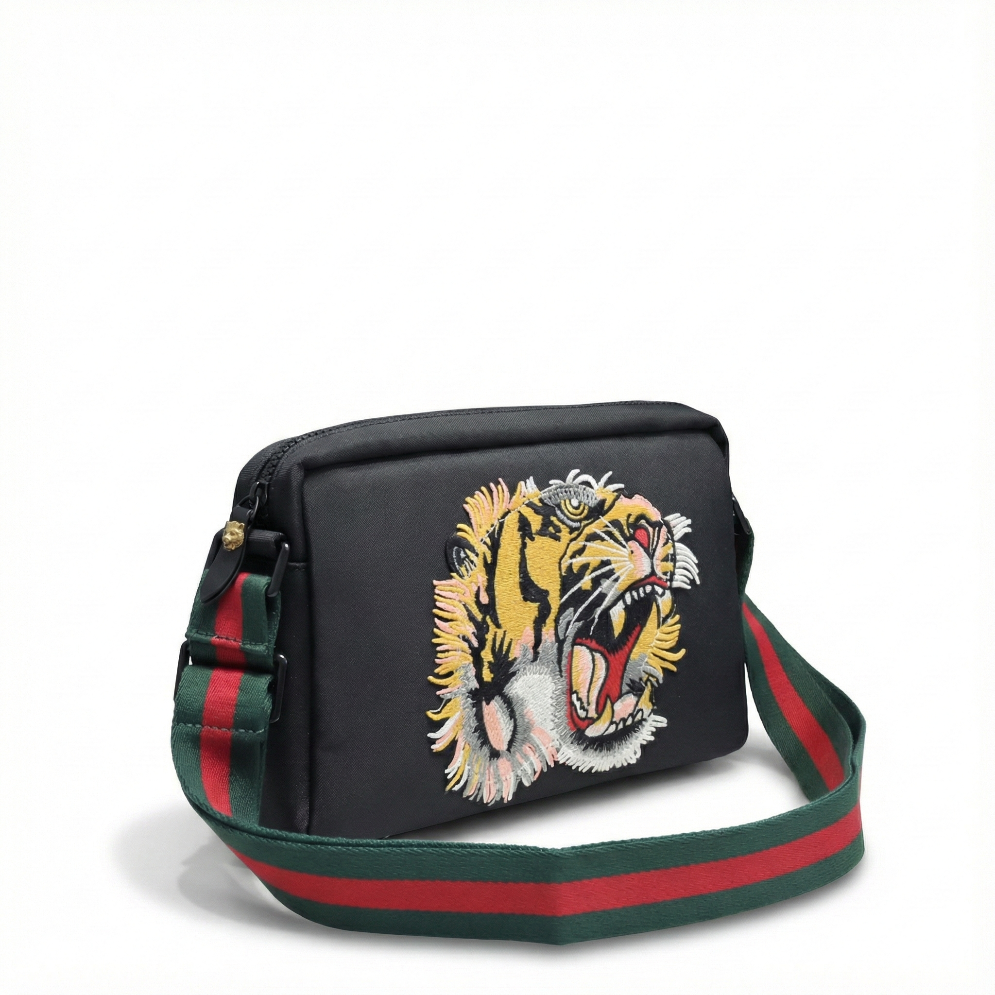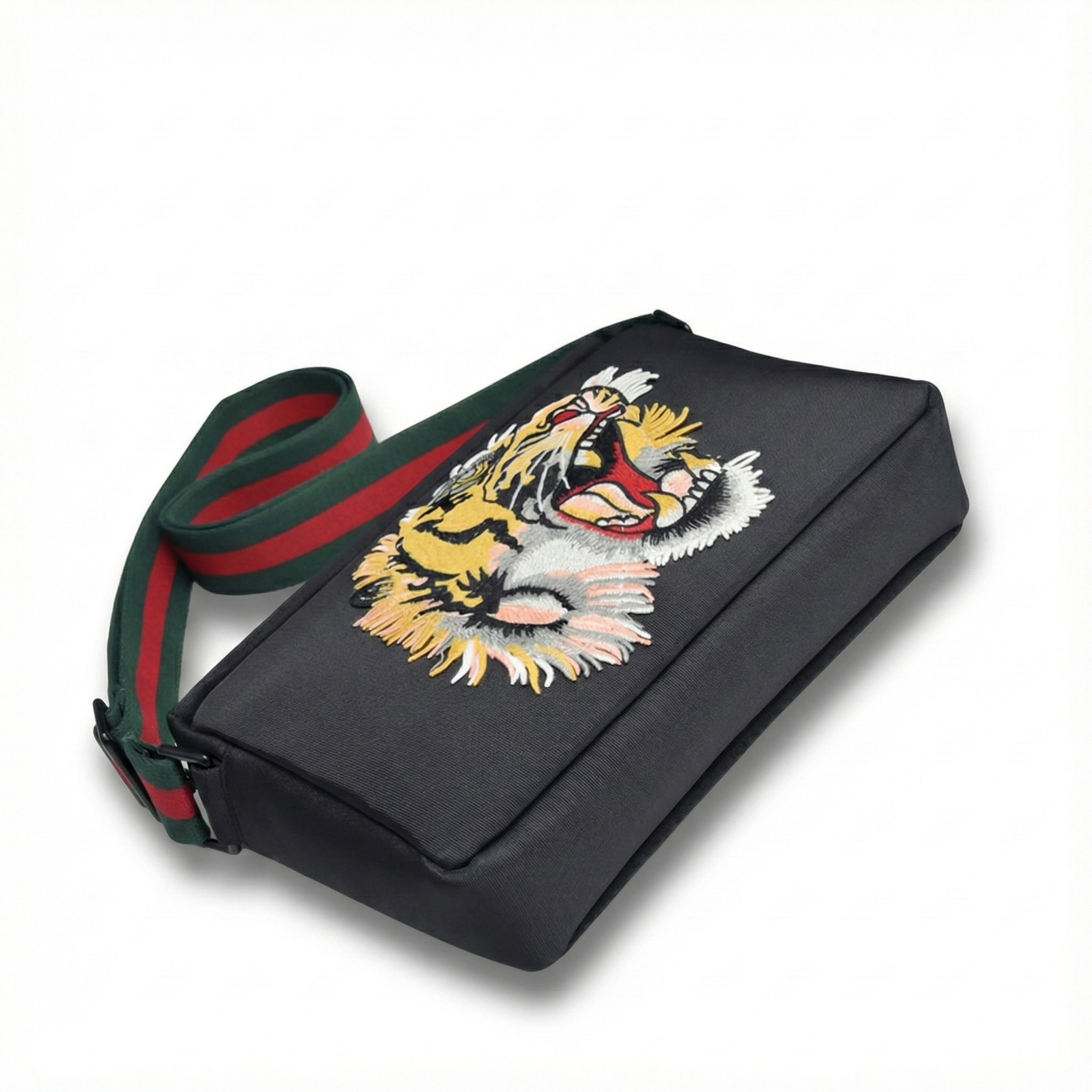 A bold expression of the House’s narrative codes, this small messenger bag is defined by a striking embroidered tiger motif—an emblem of strength and untamed elegance frequently revisited in Gucci collections. Crafted from durable GG Supreme canvas, the design is complemented by refined leather trims and the signature Web strap, creating a balance between heritage detail and contemporary attitude. Compact yet functional, the bag is designed for everyday wear while making a distinctive statement.